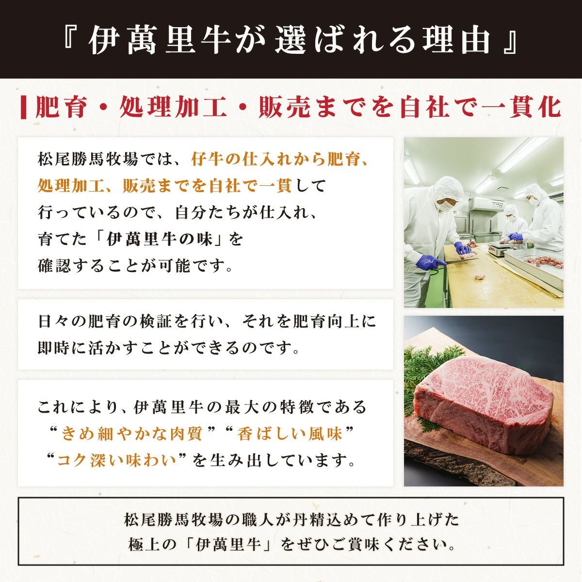 松尾勝馬牧場では、伊萬里牛(伊万里牛)の飼育から販売までを一貫して行う「6次産業化」に取り組んでいます。 「6次産業化」により、ストレスフリーで高水準な飼育(牧場)や品質管理と衛生管理(加工場)、感動の味わいと魅力的なコスパ(レストラン)などが可能となり、常に一定の美味しさで伊萬里牛(伊万里牛)をいただくことができます。